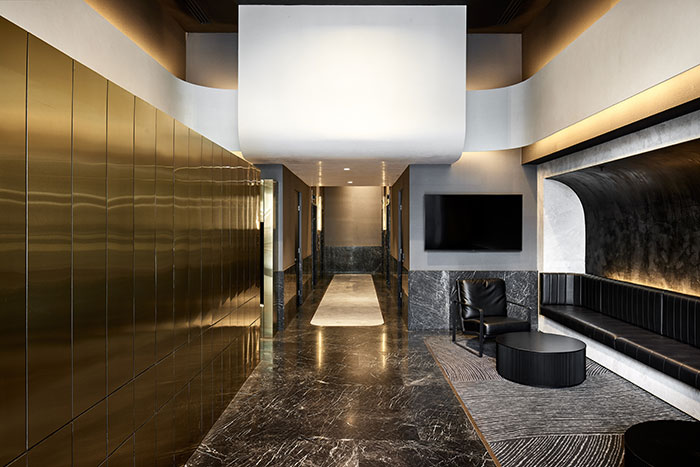 These interiors seek to capture the essence of bending reflections of light as it moves gently across curvilinear surfaces. Each curve carries the guest through, submerging them within the layers, materials and forms which work together to reflect light, creating a sophisticated and inviting interior.