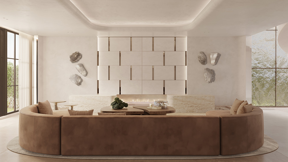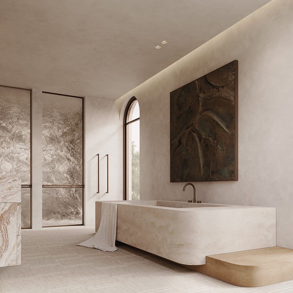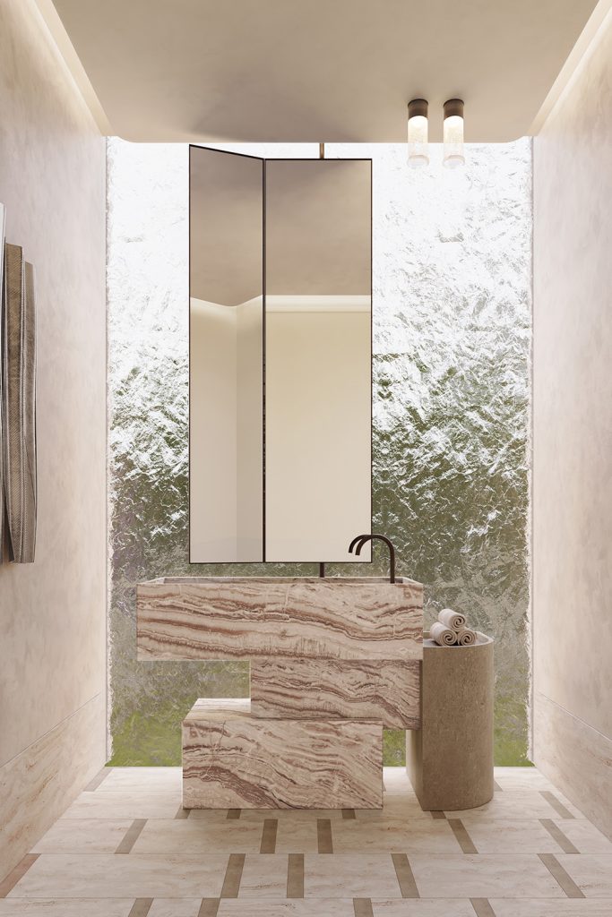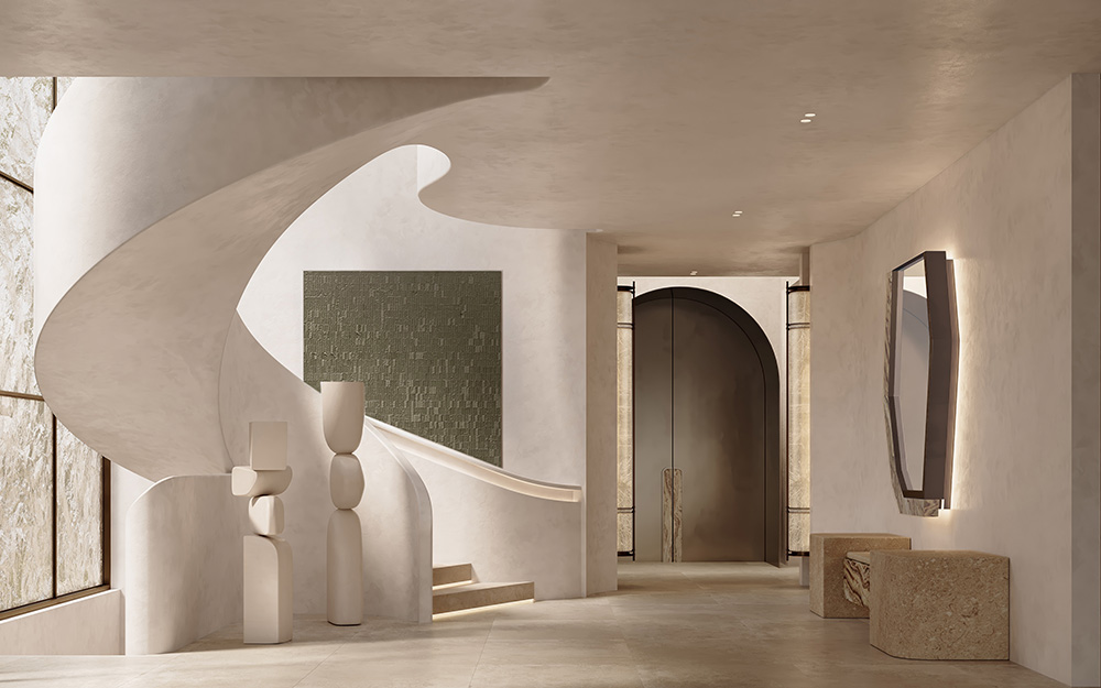This interplay is enhanced by luxurious materials all set against a backdrop of warm, inviting neutrals and raw, natural textures.