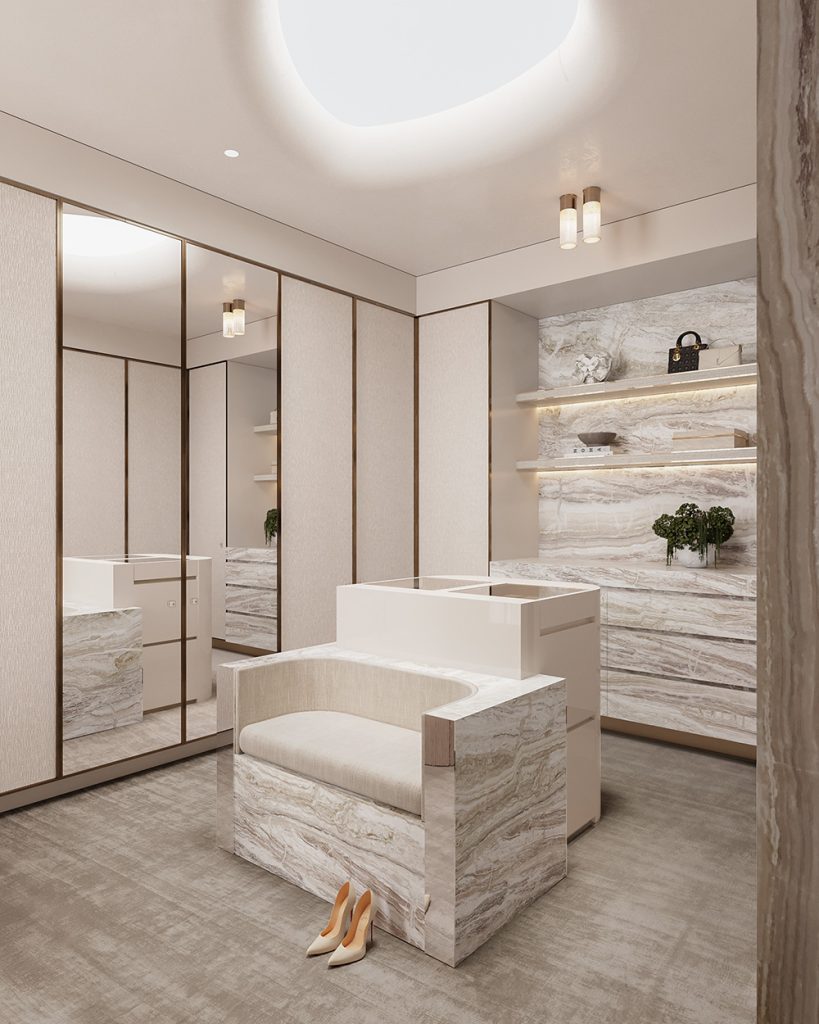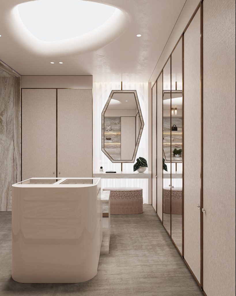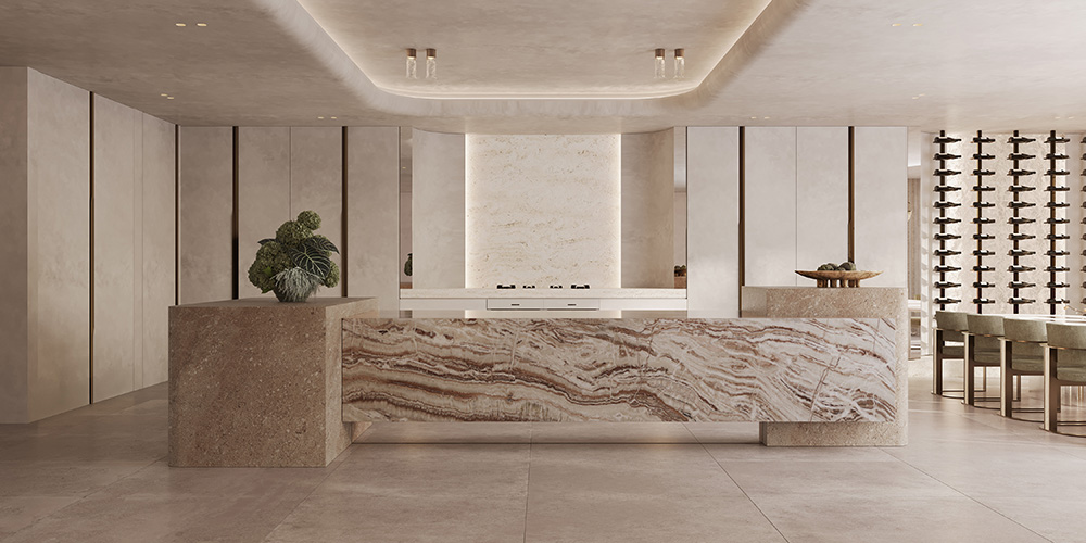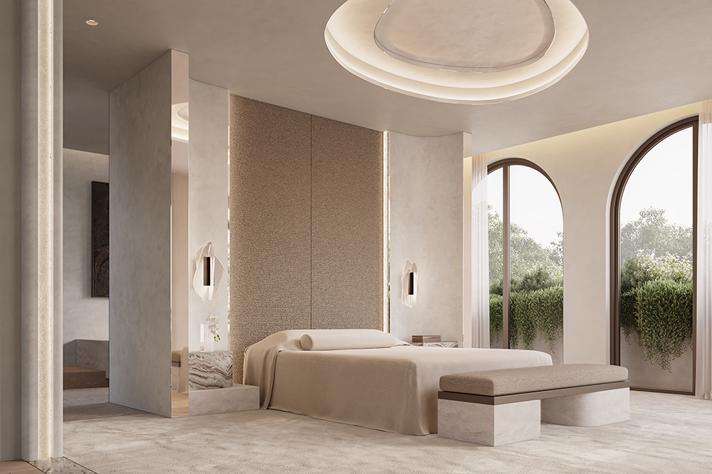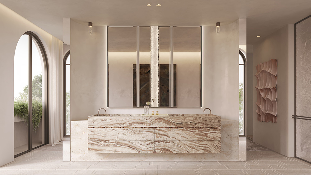 This interplay is enhanced by luxurious materials all set against a backdrop of warm, inviting neutrals and raw, natural textures.